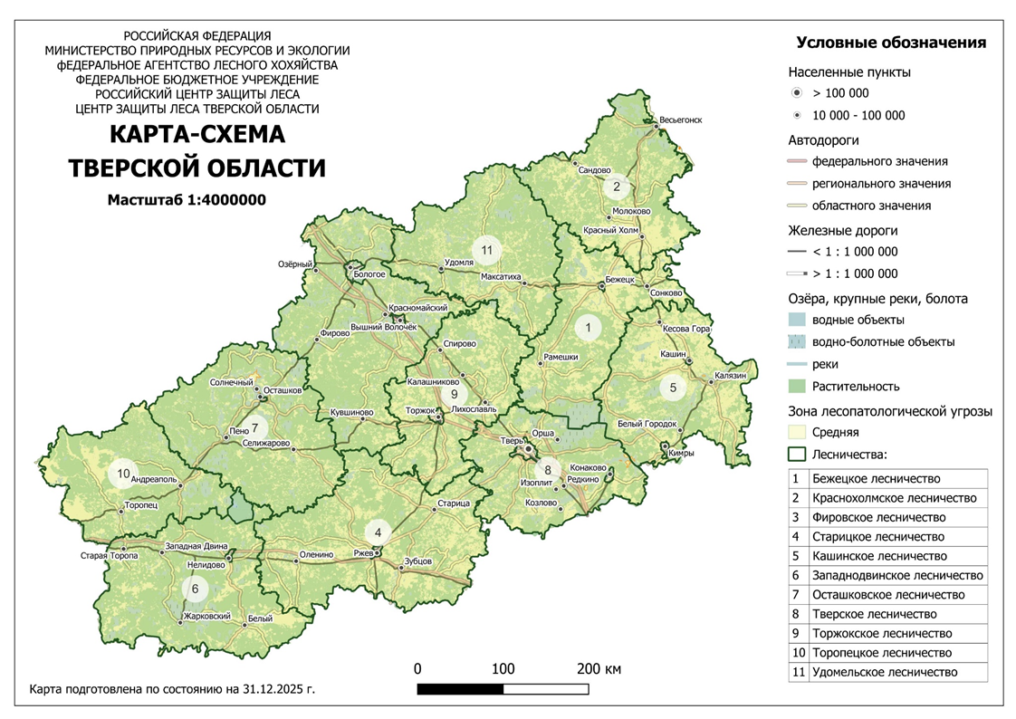 Наибольшую угрозу для насаждений в 2026 году будут представлять губка корневая в Старицком, Краснохолмском и Торопецком лесничествах, рак смоляной (серянка) в Кашинском и Бежецком лесничествах, пяденица зимняя в Тверском и Торжокском лесничествах.