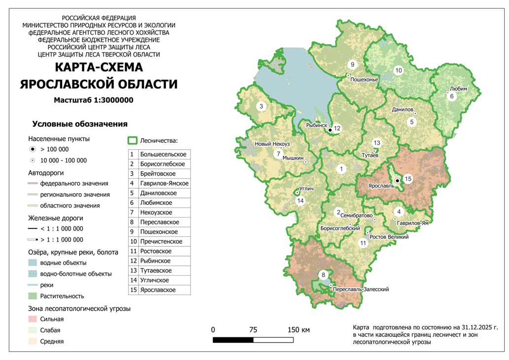 За 2025 год РНН проведены в 13 лесничествах Ярославской области на 147 ППН на площади 1,22 млн. га. Все ППН находятся в зонах слабой, средней и сильной лесопатологической угрозы. Определено, что текущий отпад в лесных насаждениях с основными лесообразующими породами берёзы, ели, осины и сосны не превышает естественный.
